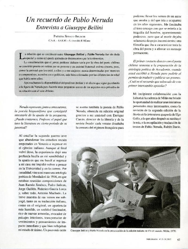 Un recuerdo de Pablo Neruda. Entrevista a Giuseppe Bellini [artículo] Patrizia Spinato Bruschi