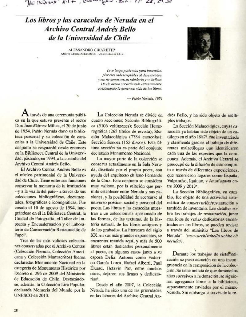 Los libros y las caracolas de Neruda en el Archivo Central Andrés Bello de la Universidad de Chile [artículo] Alessandro Chiaretti.