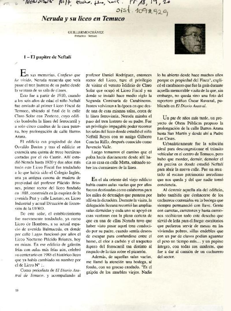 Neruda y su liceo en Temuco [artículo] Guillermo Chávez.