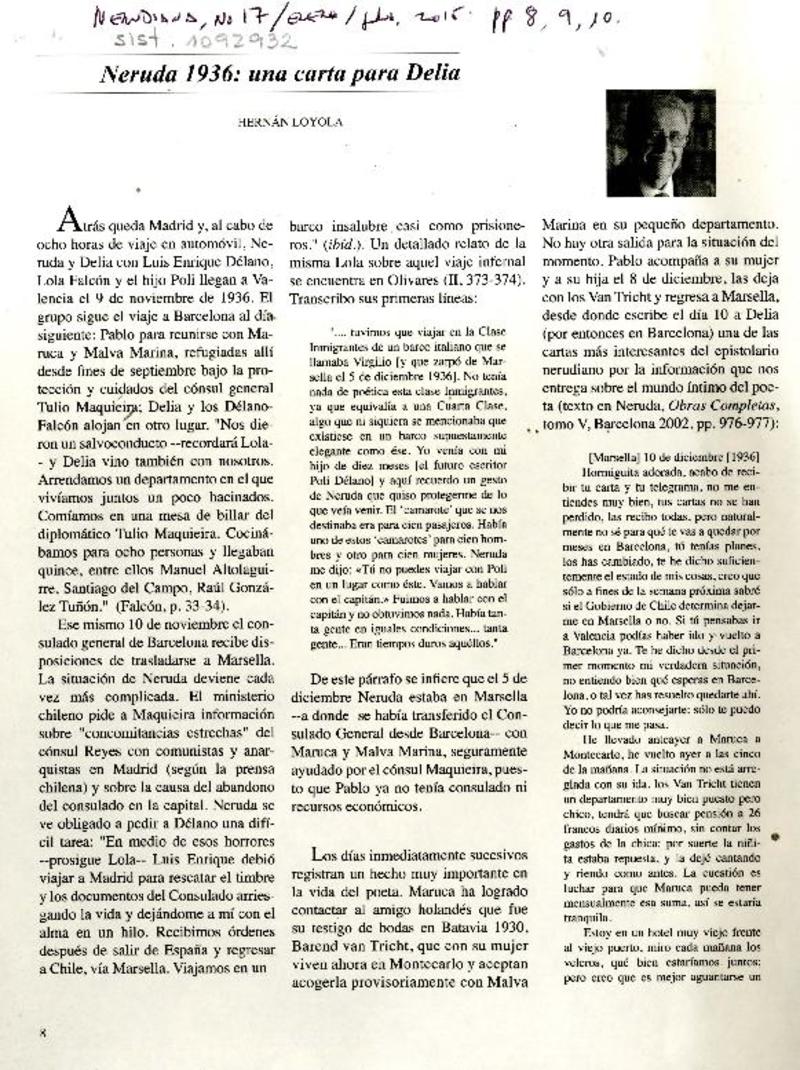Neruda 1936: una carta para Delia [artículo] Hernán Loyola.