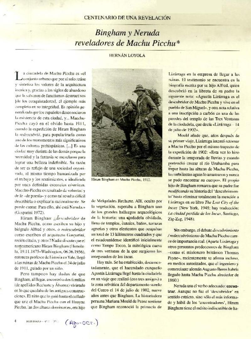 Bingham y Neruda reveladores de Machu Pichu [artículo] Hernán Loyola.