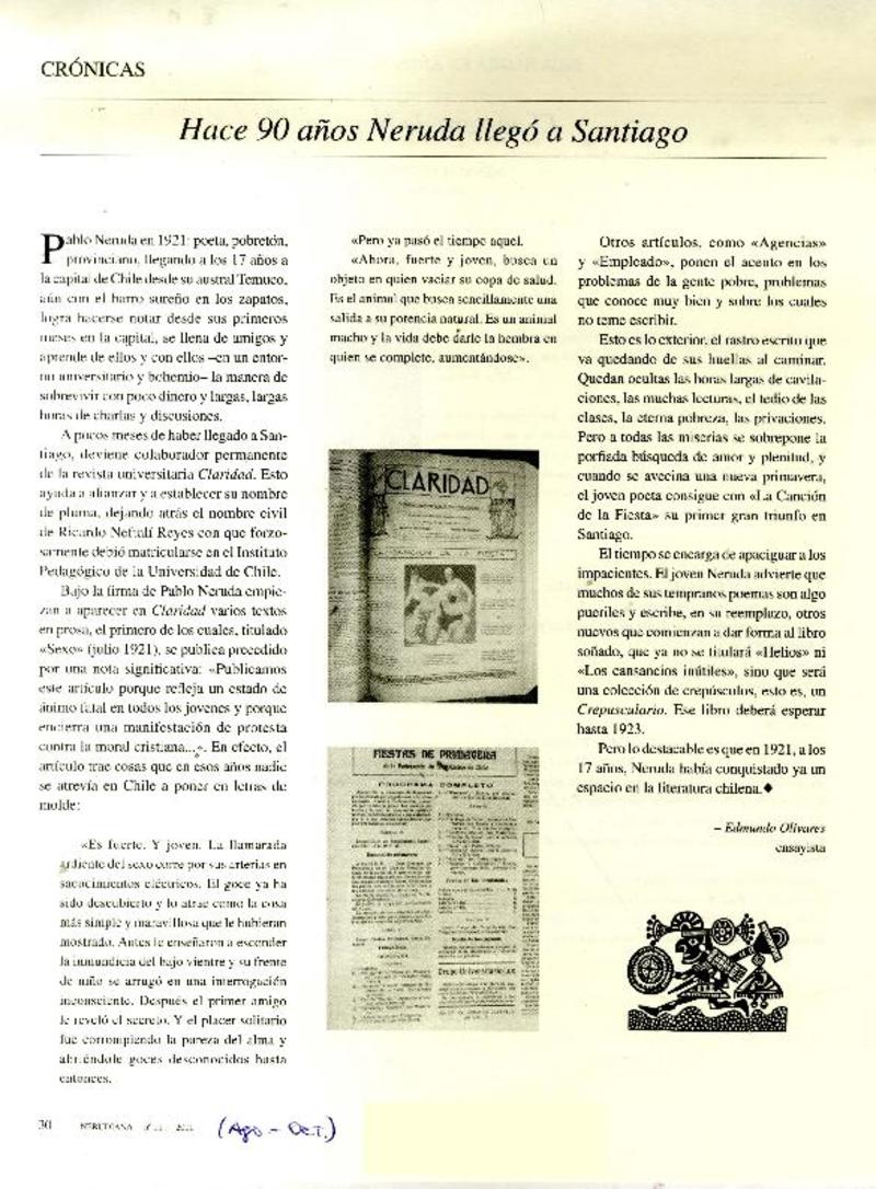 Hace 90 años Neruda llegó a Santiago [artículo] Edmundo Olivares.