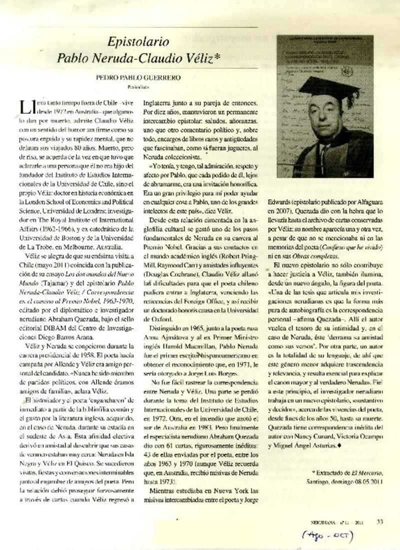Epistolario Pablo Neruda-Claudio Véliz [artículo] Pedro Pablo Guerrero.
