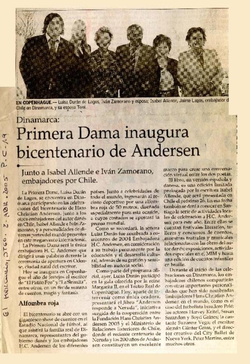 Primera dama inaugura bicentenario de Andersen. [artículo]