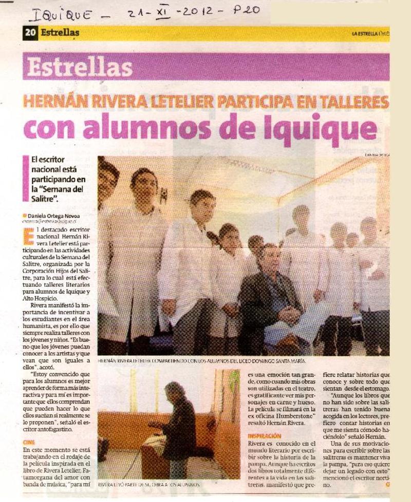 Hernán Rivera Letelier participa en talleres con alumnos de Iquique [artículo] Daniela Ortega Novoa.