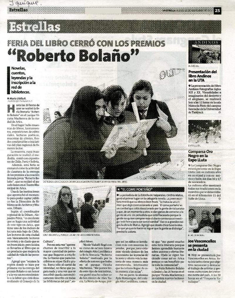 Feria del libro cerró con los premios "Roberto Bolaño" [artículo] Mario Ubilla R.