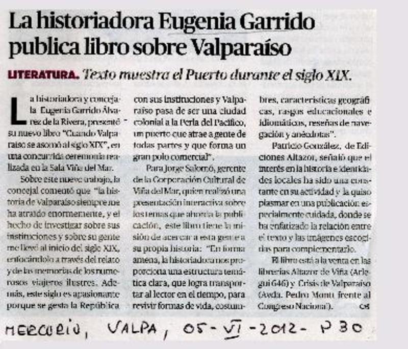 La historia Eugenia Garrido publica libro sobre Valparaíso. [artículo]