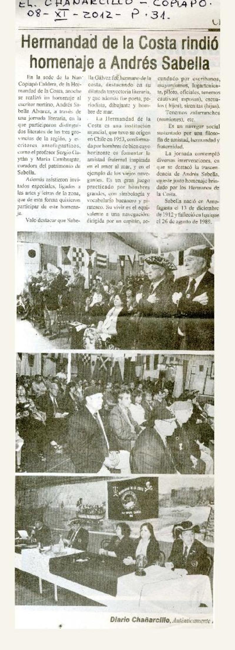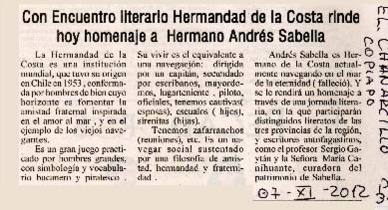 Con encuentro literario Hermandad de la Costa rinde hoy homenaje a hermano Andrés Sabella. [artículo]