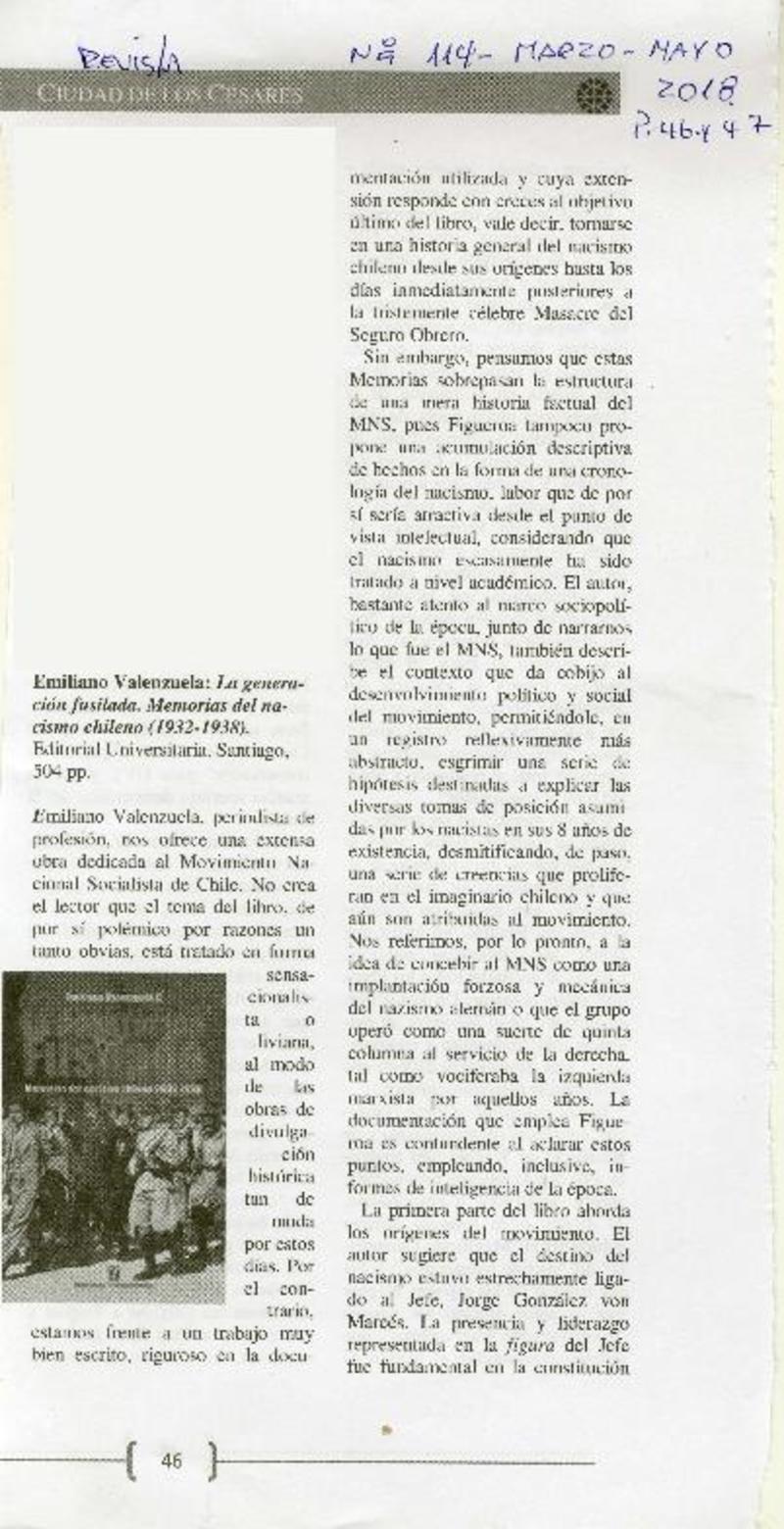 Emiliano Valenzuela: La generación fusilada. Memorias del nacismo chileno (1932-1938) [artículo] Rodrigo Naranjo.