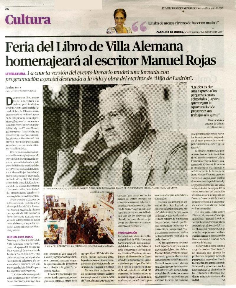 Feria del libro de Villa Alemana homenajeará al escritor Manuel Rojas [artículo] Paulina Serra.
