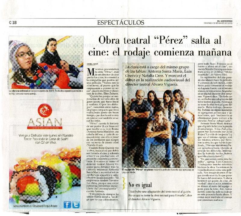 Obra teatral "Pérez" salta al cine [artículo] Daniel Olave.