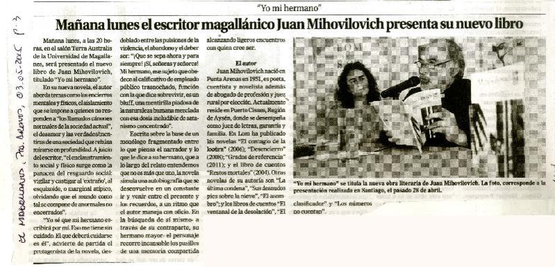 Mañana lunes el escritor magallánico Juan Mihovilovich presenta su nuevo libro [artículo].