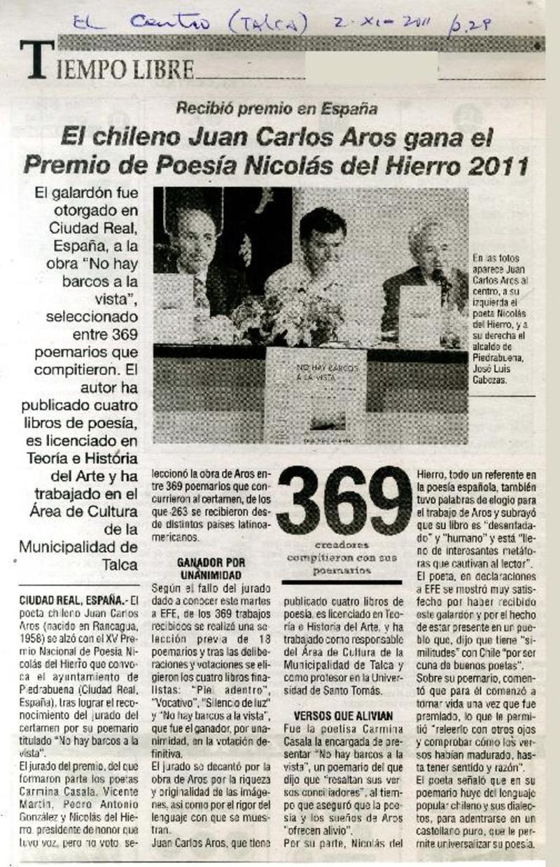 El chileno Juan Carlos Aros gana el Premio de Poesía Nicolás del Hierro 2011 [artículo].