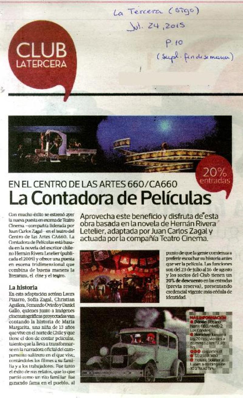 La contadora de películas cómo será lo nuevo de teatro cinema [artículo] : Pedro Bahamondes.