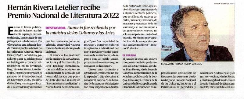 Hernán Rivera Letelier recibe Premio Nacional de Literatura 2022 [artículo].