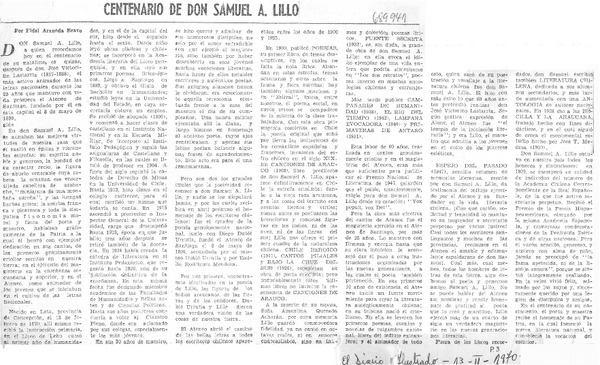 Centenario de Don Samuel A. Lillo [artículo] Fidel Araneda Bravo.