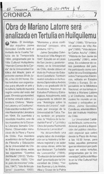 Obra de Mariano Latorre será analizada en tertulia en Huilquilemu [artículo].