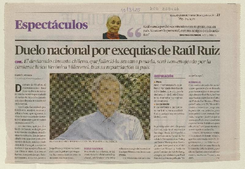 Duelo nacional por exequias de Raúl Ruiz [artículo] Daniel Carrasco.