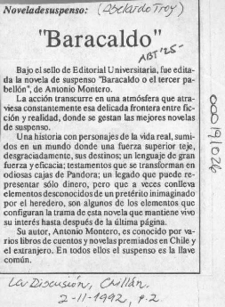 Autores chilenos - Montero Abt, Antonio - Baracaldo o el tercer pabellón
