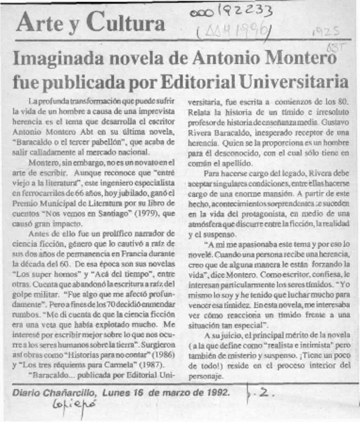 Imaginada novela de Antonio Montero fue publicada por Editorial Universitaria [artículo]