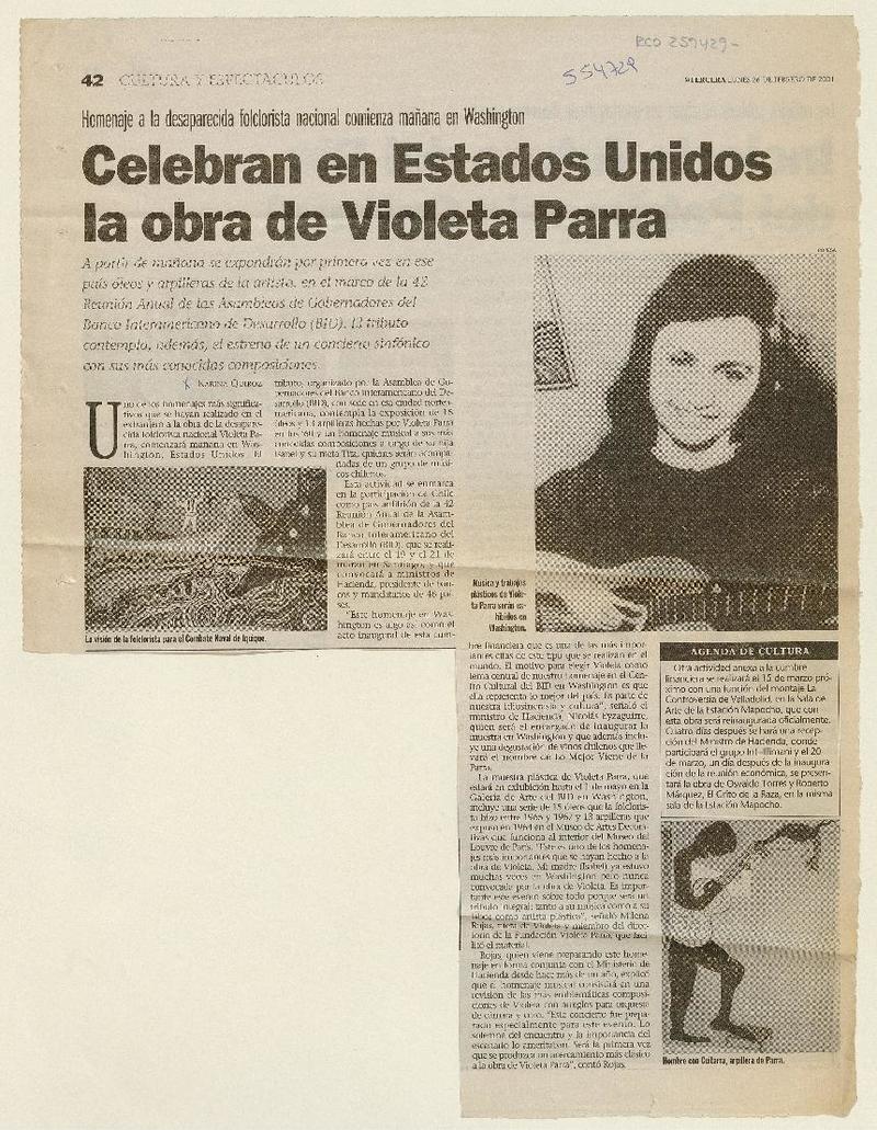 Celebran en Estados Unidos la obra de Violeta Parra [artículo] Karina Quiroz