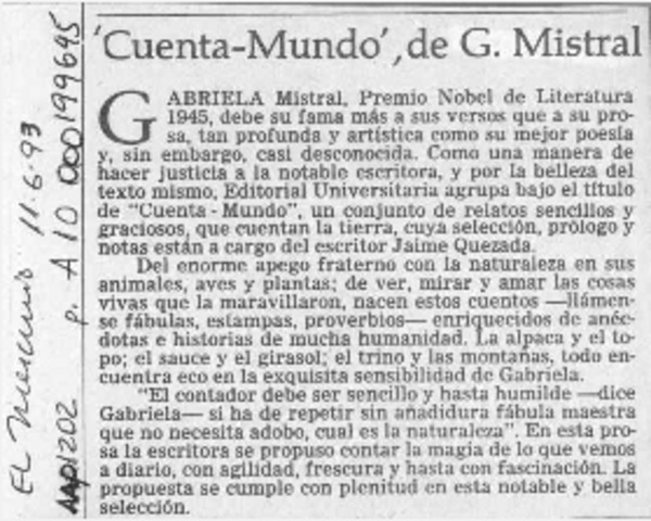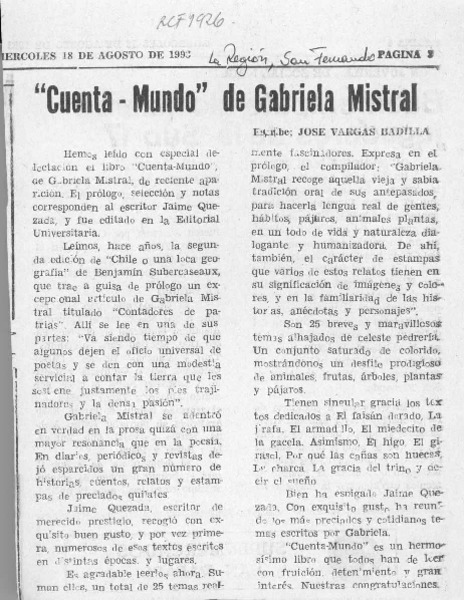 "Cuenta mundo" de Gabriela Mistral [artículo] José Vargas Badilla.