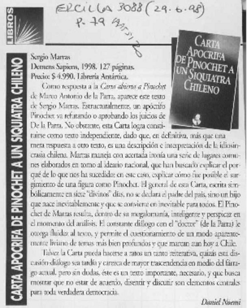 Carta apócrifa de Pinochet a un siquiatra chileno [artículo] Daniel Noemí.