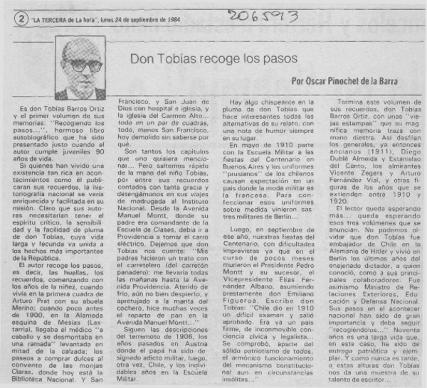 Don Tobías recoge los pasos [artículo] Oscar Pinochet de la Barra.