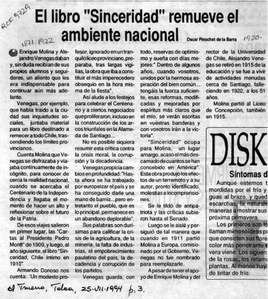 El libro "Sinceridad" remueve el ambiente nacional [artículo] Oscar Pinochet de la Barra.