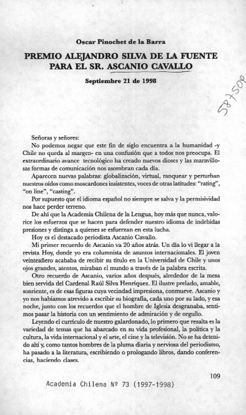 Premio Alejandro Silva de la Fuente para el Sr. Ascanio Cavallo [artículo] Oscar Pinochet de la Barra