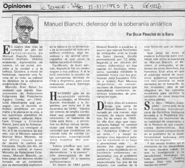 Manuel Bianchi, defensor de la soberanía antártica [artículo] Oscar Pinochet de la Barra.