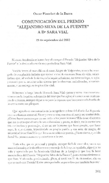 Comunicación del Premio "Alejandro Silva de la Fuente" a Da. Sara Vial [artículo] Oscar Pinochet de la Barra.