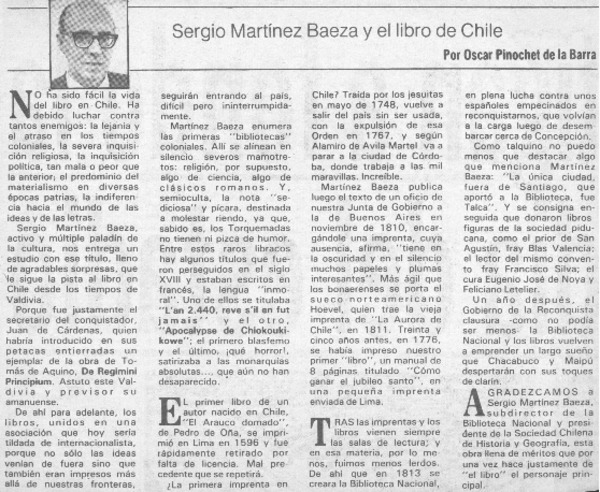 Sergio Martínez Baeza y el libro de Chile [artículo] Oscar Pinochet de la Barra.