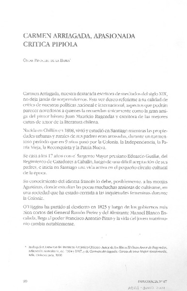 Carmen Arriagada, apasionada crítica pipiola [artículo] Oscar Pinochet de la Barra.