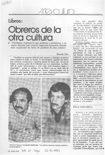 Obreros de la otra cultura : [Entrevista] [artículo] Pamela Jiles.