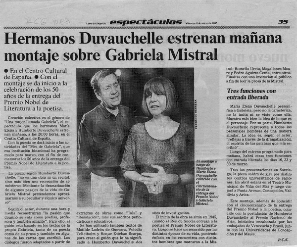 Hermanos Duvauchelle estrenan mañan montaje sobre Gabriela Mistral [artículo] P. C. S.