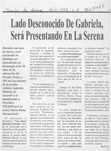 Lado desconocido de Gabriela, será presentado en La Serena [artículo] R. U. G.