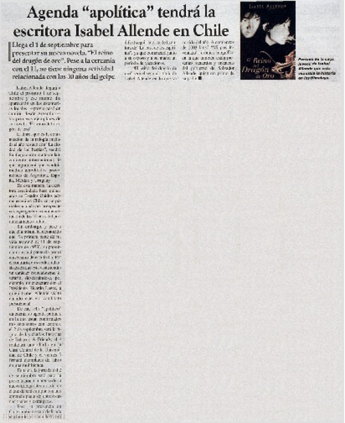 Agenda "apolítica" tendrá la escritora Isabel Allende en Chile. [artículo]