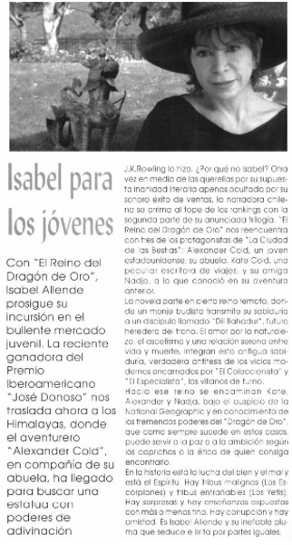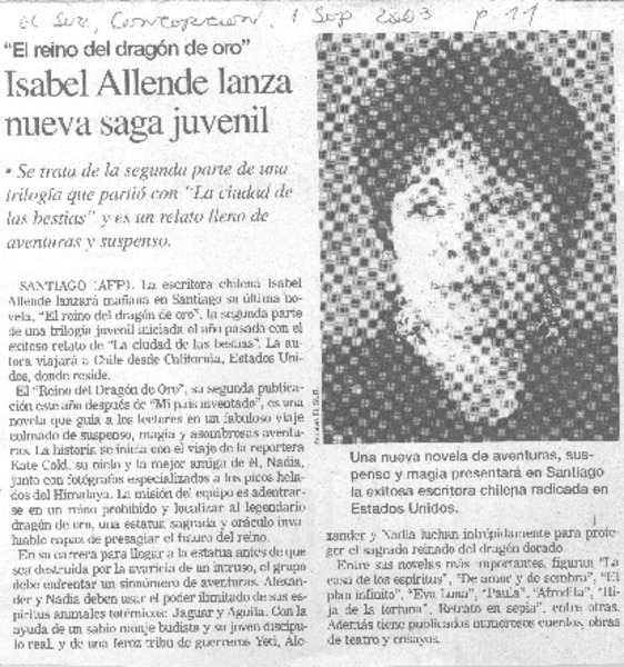 Isabel Allende lanza nueva saga juvenil "El reino del dragón de oro". [artículo] :