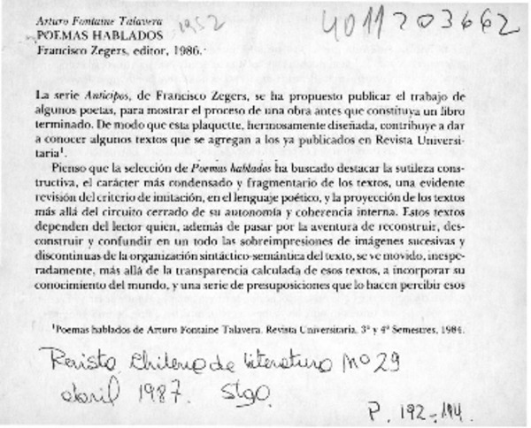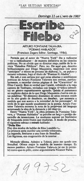"Poemas hablados", un libro de Arturo Fontaine Talavera [artículo] Eduardo Correa.