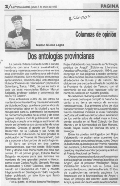 Dos antologías provincianas [artículo] Marino Muñoz Lagos.