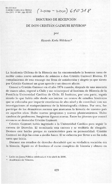 Discurso de recepción de don Cristián Gazmuri Riveros [artículo] Ricardo Krebs Wilckens.