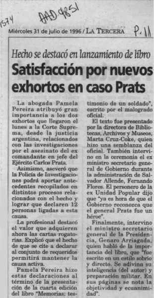 Satisfacción por nuevos exhortos en caso Prats [artículo].
