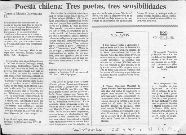 Poesía chilena, tres poetas, tres sensibilidades [artículo] Eduardo Guerrero del Río.