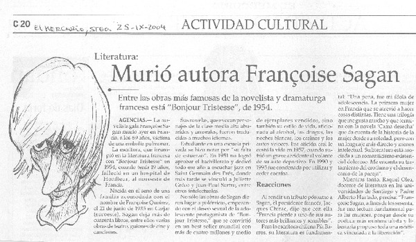 Murió autora Francoise Sagan [artículo]