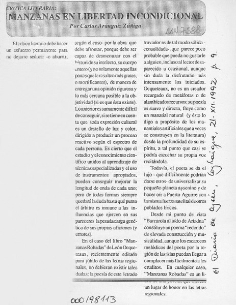 Manzanas en libertad incondicional [artículo] Carlos Aránguiz Zúñiga.