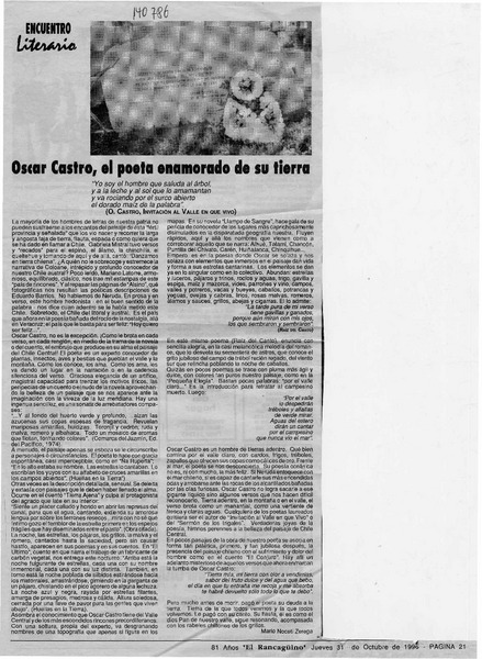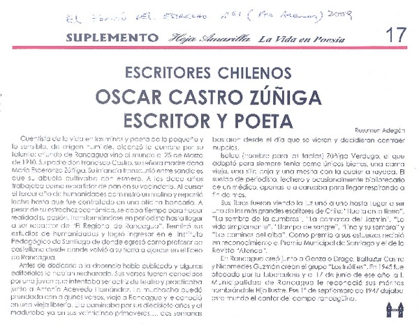 Al inolvidable poeta y escritor rancagüino, Oscar Castro Z. [artículo] Gustavo Arenas Fuenzalida.