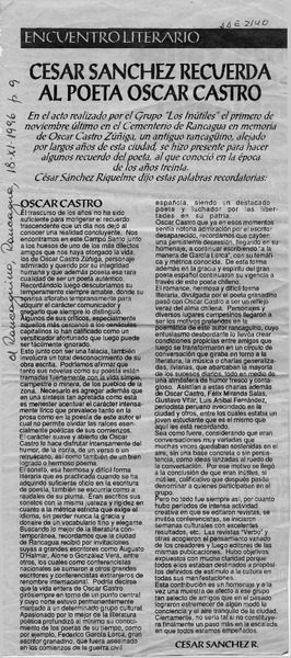 César Sánchez recuerda al poeta Oscar Castro [artículo] César Sánchez R.