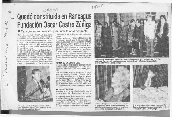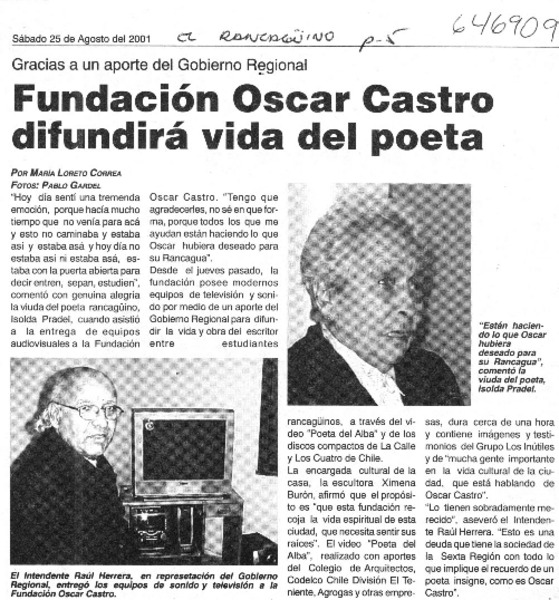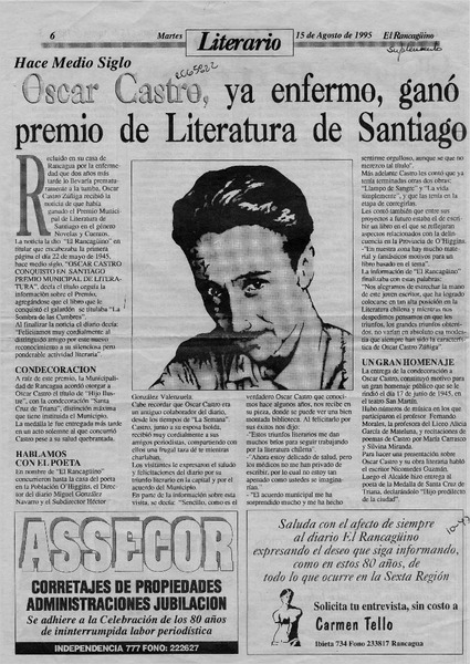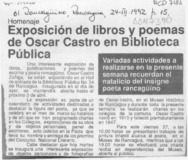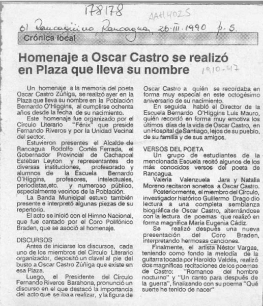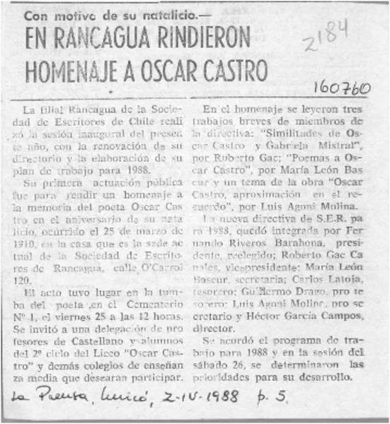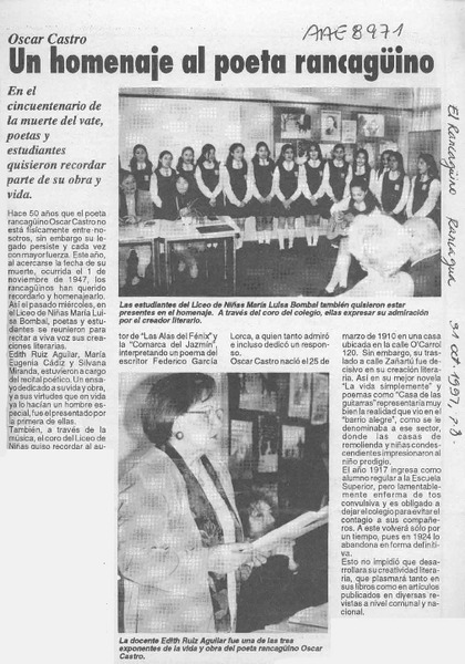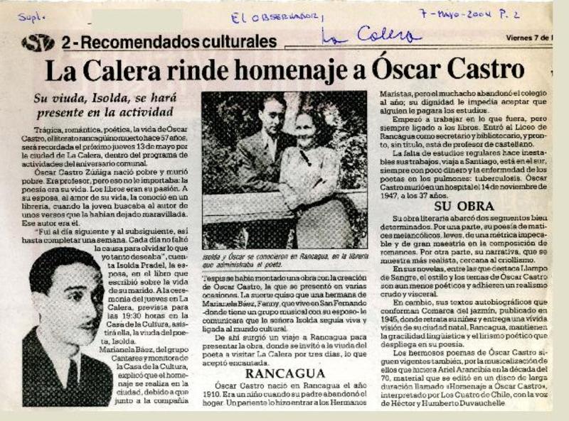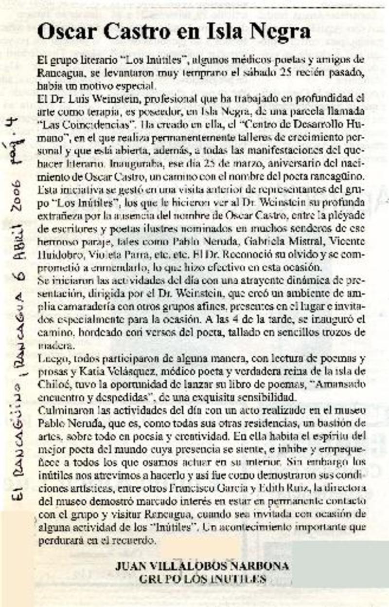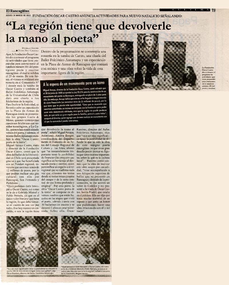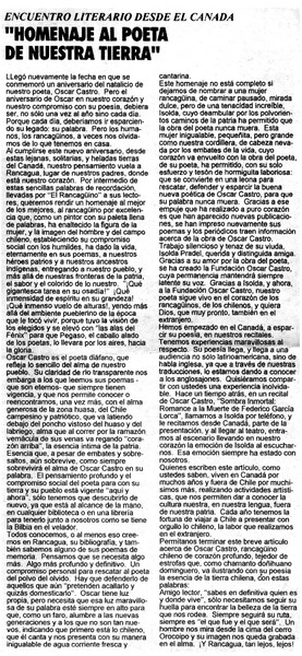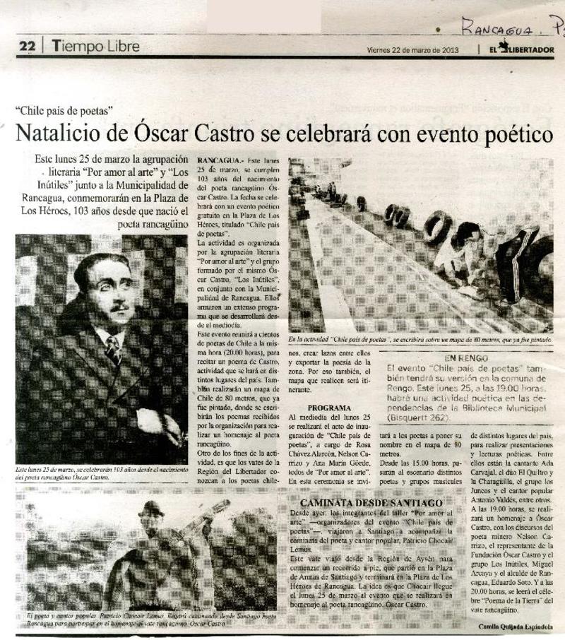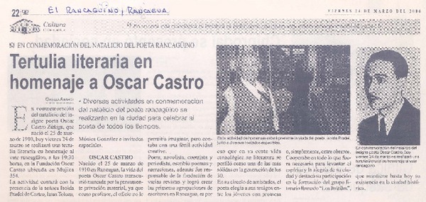 Rancagua homenajea al poeta Oscar Castro [artículo] Gisella Abarca.