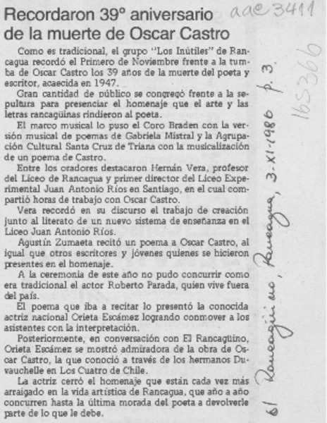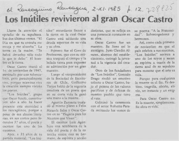 Recordaron 39 aniversario de la muerte de Óscar Castro [artículo].